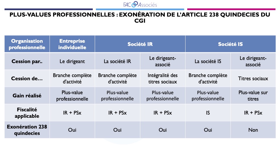 Vous trouverez un tableau synthétisant les mutations concernées par les dispositions de l’article 238 quindecies du CGI, les conditions d’application avant et après mutation, ainsi que les modalités d’application de l’exonération qui en découlent (2 pages / dernière MàJ 01/02/2022)